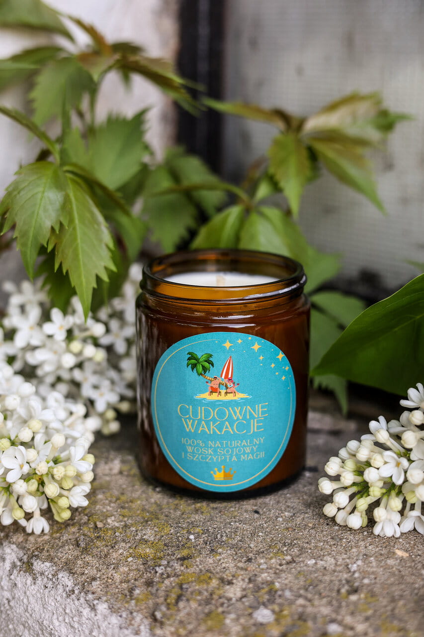Płomień świecy sojowej CUDOWNE WAKACJE i jej zapach tworzą niesamowity nastrój: